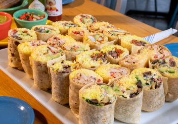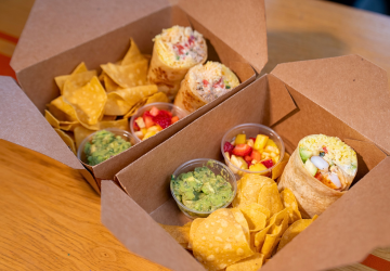 Individual burrito lunches with fresh fruit, corn tortilla chips, and a side of guacamole. Choose from our classic burrito types to build your boxes.